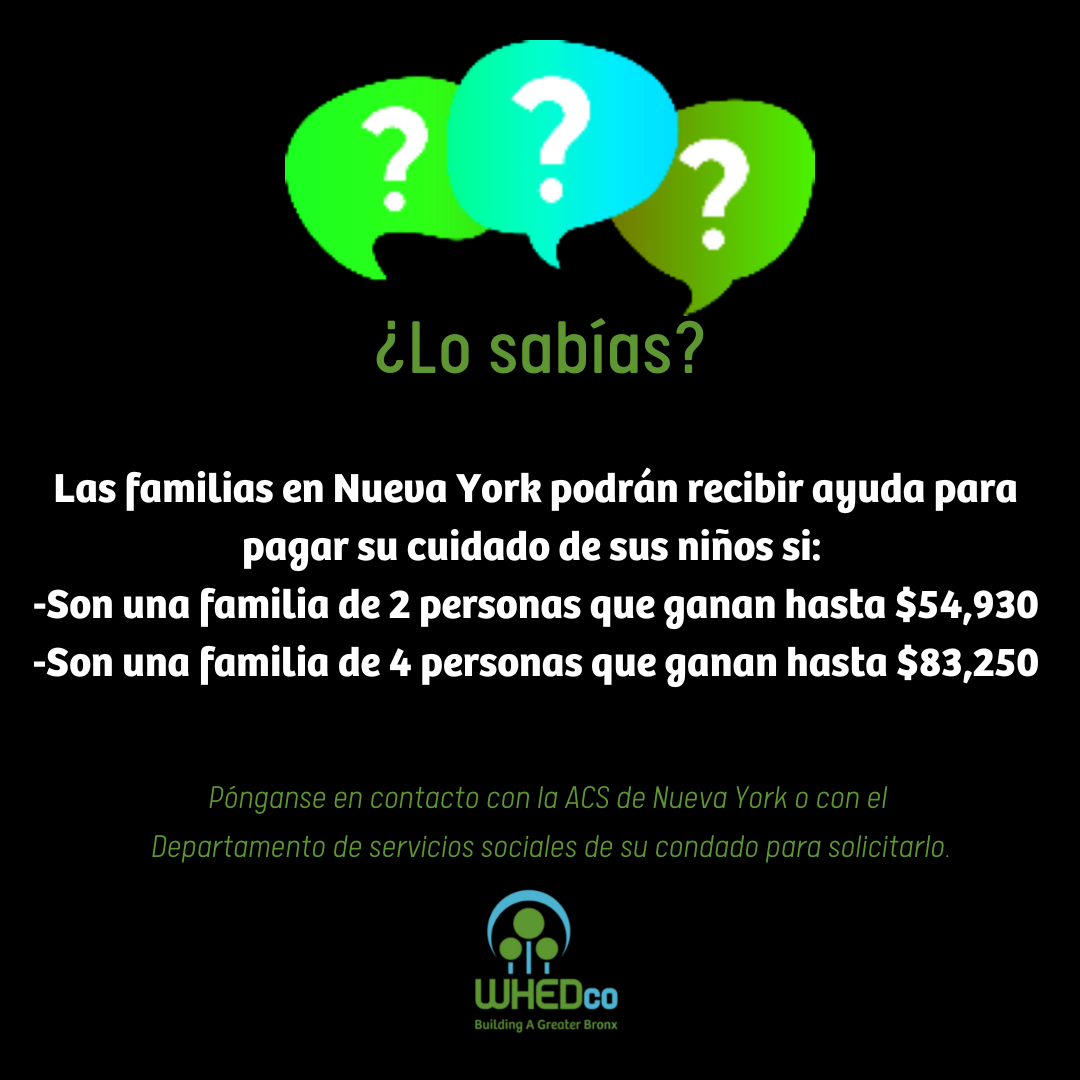 Si necesita ayuda para pagar su cuidado de sus niños, podrá ser elegible para aplicar hoy. Contacte la ACS de Nueva York o el Departamento de servicios sociales de su condado para solicitarlo.